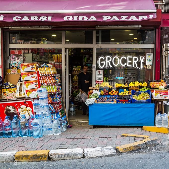 - π Perfect Business Decoration π: Grocery LED signs can decorate your personal style and create a unique atmosphere. Adding " Grocery" neon lights signs can liven up any dull space and is an essential groceries decoration. It is also an ideal gift for weddings, birthdays, Valentine's Day, Christmas and other celebratory occasions, perfect for anyone who likes a fun and interesting atmosphere.