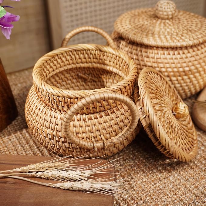 - Functional Storage Basket: The rattan woven basket can keep your table tidy and neat.The small rattan basket is suitable for storing wrapped candies or cookies,snacks,fruit,keys,lipsticks and small items.The lid can keep your things inside neat and intact.