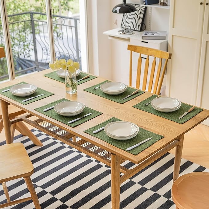 Demetex Green Placemats Set of 6 Vintage Cloth Textured Place Mats Stain Resistant for Holiday Barbecue and Dinning Table, Green