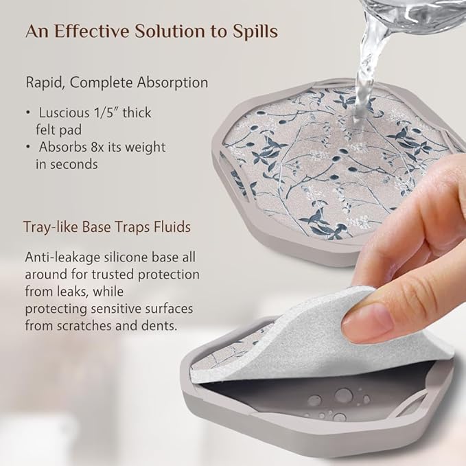 - RESPECT WOOD - Featuring material mashup, it effortlessly protects your table - all day, every day [ Safe from Spills and Permanent Damage ] The 1⁄5" thick soft felt pad can absorb as much as ¼ cup of liquid in seconds, and the silicone base offers leak-free protection while protecting your sensitive surfaces from scratches and dents [ Elevated Experience ] The embossed geometric pattern enhances grip without leaving residue while keeping air circulating to make the coaster easier to pick up