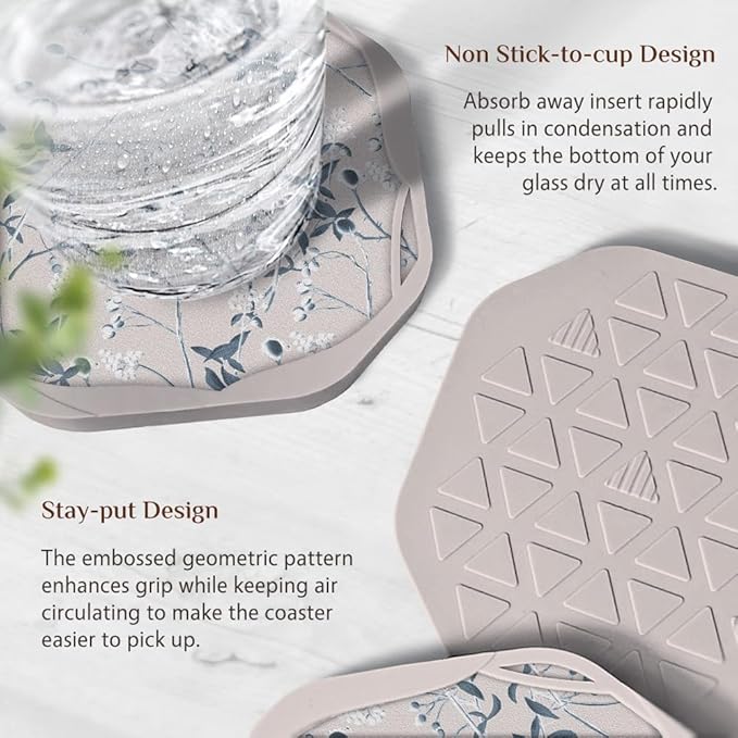 - HYBRID SILICONE AND FELT - It combines the best of both materials for a lightweight yet durable, all-purpose coaster. The non-slip silicone base keeps your cups in place while the super absorbent felt insert soaks up any moisture from your glass. In addition, the decorative case has a pretty lip with charming reliefs around the edges, which nicely frames the tailored insert, preventing it from popping up