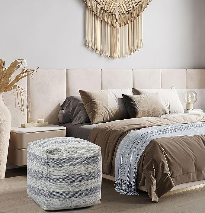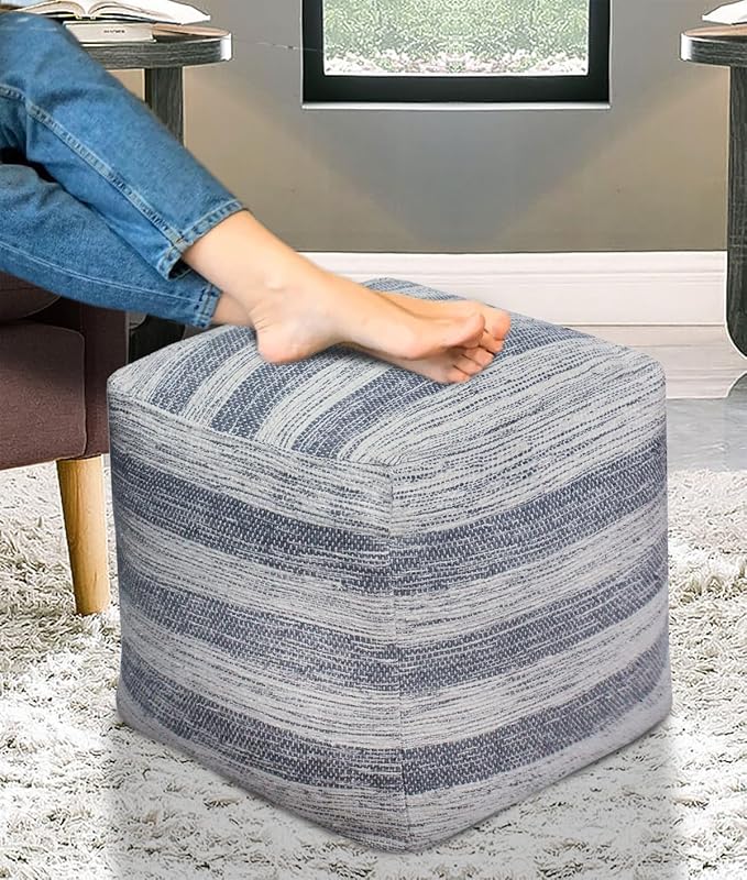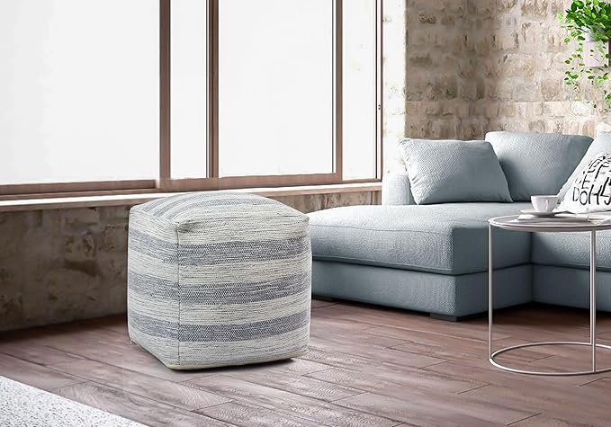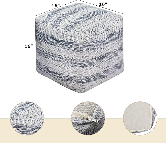 - Design: Expertly made from 100% Cotton by trained artisans, this 16-inch square pouf packs a big punch on many design levels. Its home friendly color works with any design style. The woven cotton creates a rich dimension to this already highly functional ottoman.