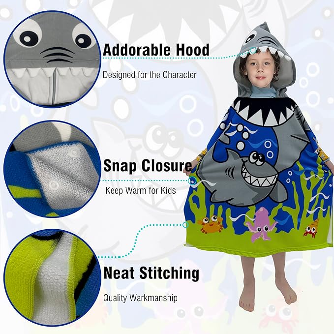 - ?Free Kids' Hands ?This kids hooded beach towel is oversized design. Kids will love how easy this hooded beach towel is to put on and easily use their hands while being covered compared to other hooded towels. There're 2 snaps on each side. It works like a poncho for after the pool/bath/beach rather than a regular beach towel. Takes the hassle out of drying kids off with a towel dragging on the ground!