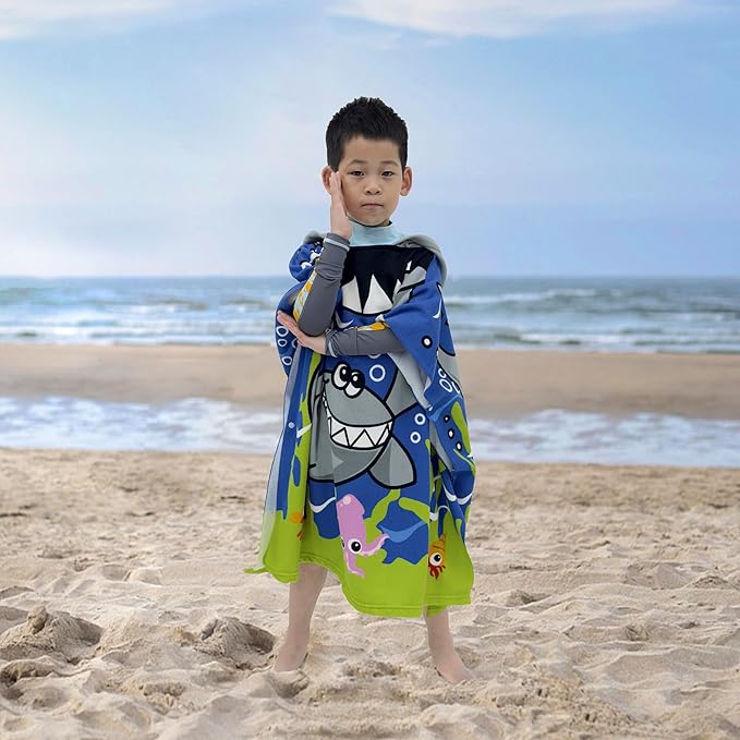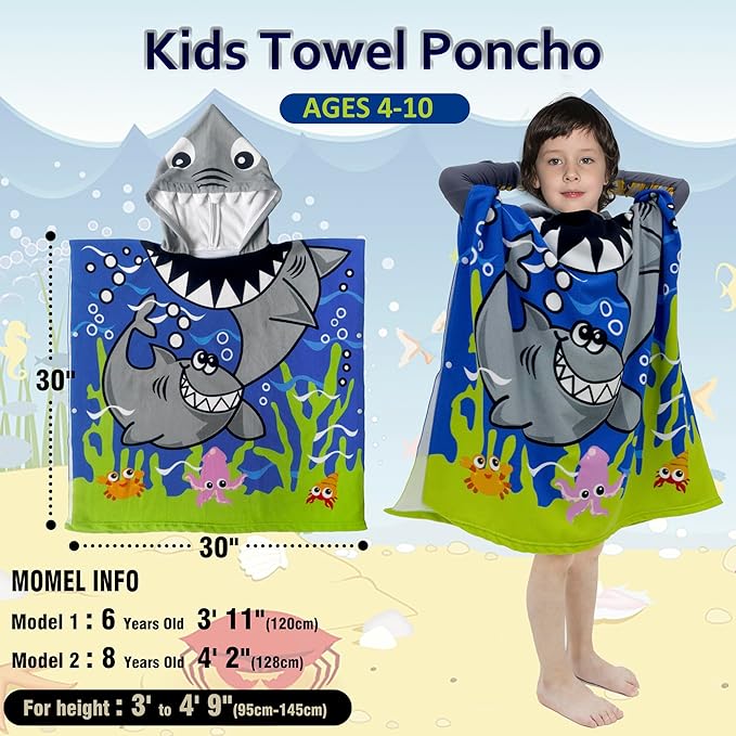 - ?Multi Uses?There's enough room to wrap around and cuddle up in. This poncho beach towels for kids are designed to dry their body or keep warm for kids, girls, and boys. It?s great for after the beach, pool, or bath, as well as to cover up before and after swim lessons. The size is 30??W X 30 "L for kids around 37" to 57" height.