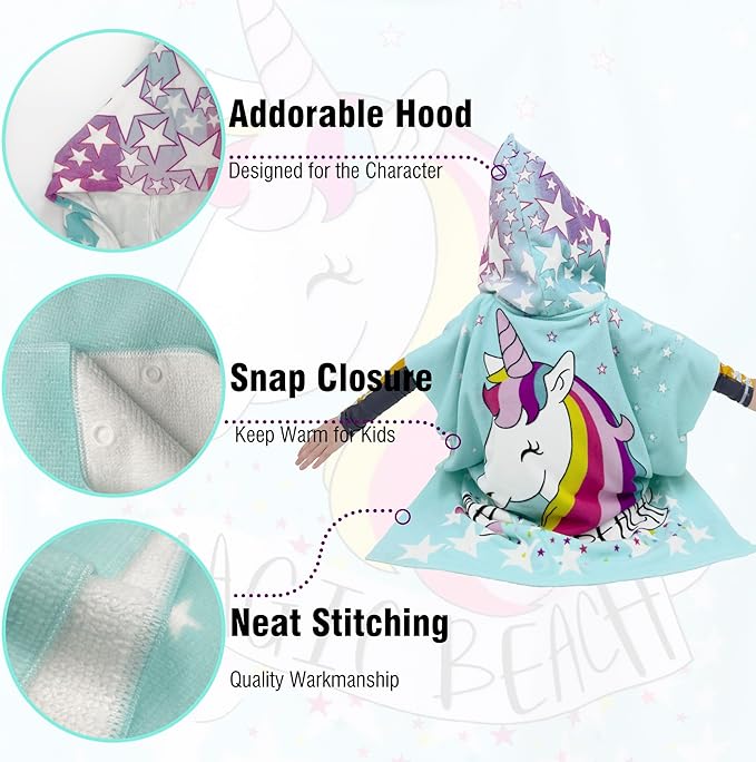 Hooded Kids Beach Towels - Toddler Bath Towel Girls Boys Swim Cover-ups for Ages 4 to 10 Kids Pool Towels Quick Dry Lightweight Soft Microfiber Poncho 30x30 with Bag (Aqua Unicorn)