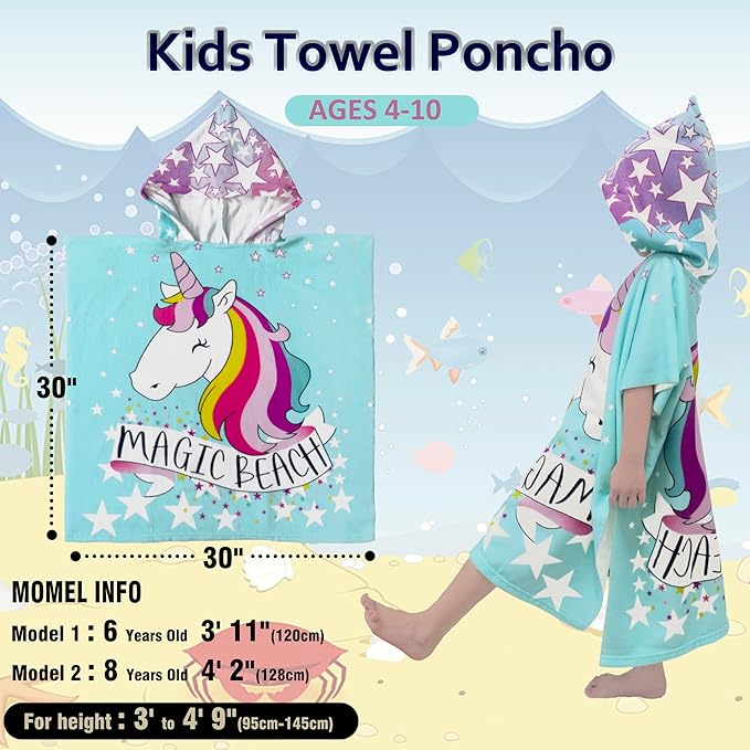 - ?Multi Uses?There's enough room to wrap around and cuddle up in. This poncho beach towels for kids are designed to dry their body or keep warm for kids, girls, and boys. It?s great for after the beach, pool, or bath, as well as to cover up before and after swim lessons. The size is 30??W X 30 "L for kids around 37" to 57" height.