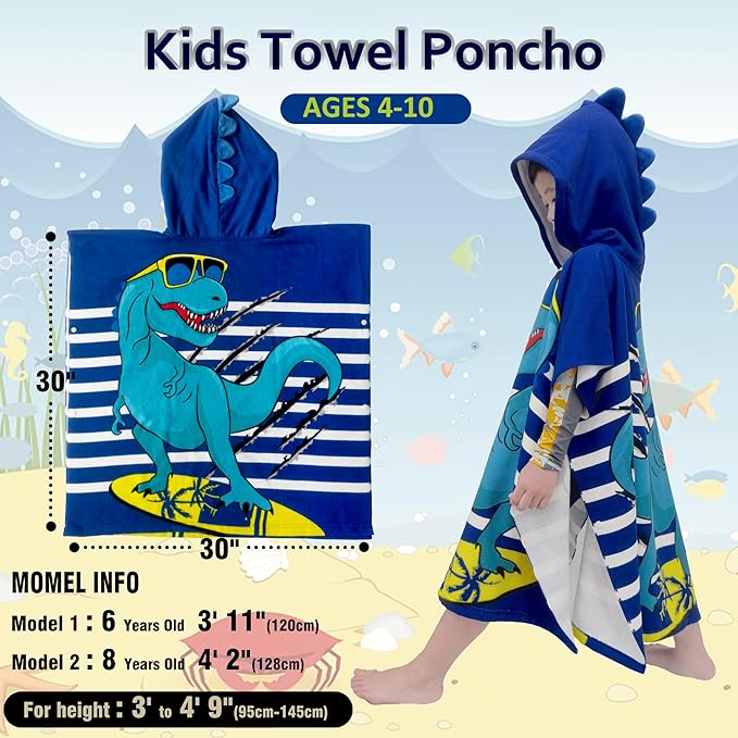 - ?Multi Uses?There's enough room to wrap around and cuddle up in. This poncho beach towels for kids are designed to dry their body or keep warm for kids, girls, and boys. It?s great for after the beach, pool, or bath, as well as to cover up before and after swim lessons. The size is 30??W X 30 "L for kids around 37" to 57" height.