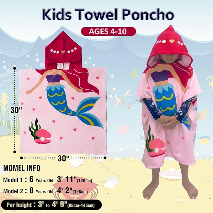 - ?Multi Uses?There's enough room to wrap around and cuddle up in. This poncho beach towels for kids are designed to dry their body or keep warm for kids, girls, and boys. It?s great for after the beach, pool, or bath, as well as to cover up before and after swim lessons. The size is 30??W X 30 "L for kids around 37" to 57" height.