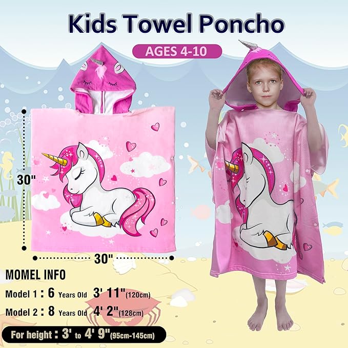 - ?Multi Uses?There's enough room to wrap around and cuddle up in. This poncho beach towels for kids are designed to dry their body or keep warm for kids, girls, and boys. It?s great for after the beach, pool, or bath, as well as to cover up before and after swim lessons. The size is 30??W X 30 "L for kids around 37" to 57" height.