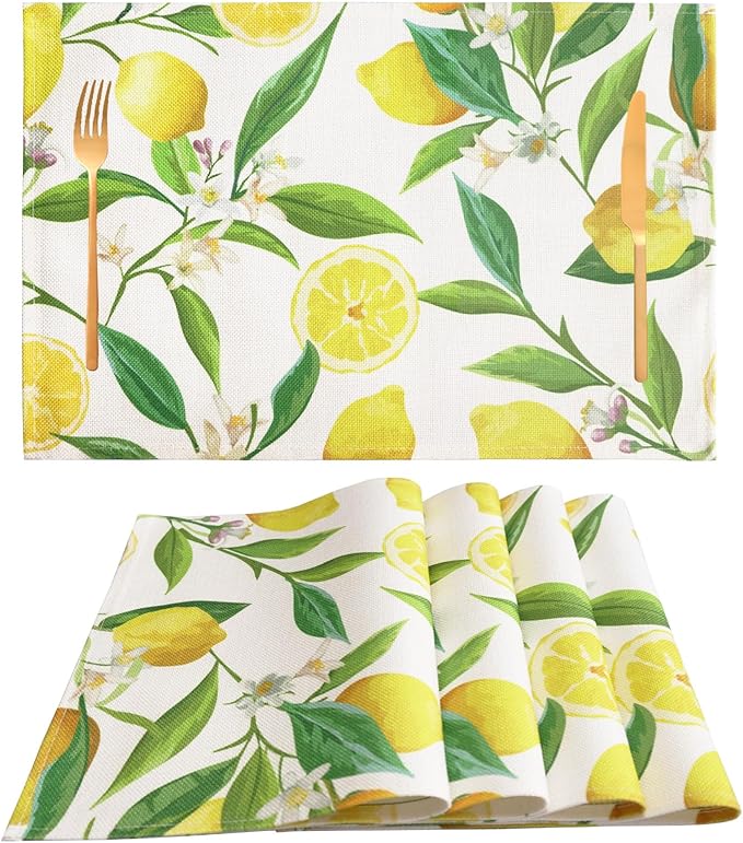 Lemon Table Placemats Set of 4 Place Mats Linen Washable Wipeable Placemats Heat Resistant Placemats Fabric Waterproof Rectangle Table Mat for Kitchen Dining Dinner 18 X 12 Inch, Lemon