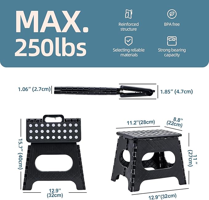- 🔒Anti-Skid & Heavy Duty: This folding stool has a maximum weight capacity of 250 pounds, making it safe for children to use whether they are sitting or standing on it. The seat surface is equipped with anti-slip dots, and each leg of the stool is equipped with anti-slip foot pads to prevent easy sliding. However, we still recommend that children children under the age of six use the stool under adult supervision, especially when standing on it.