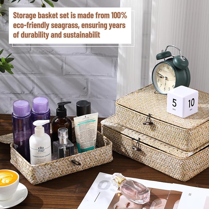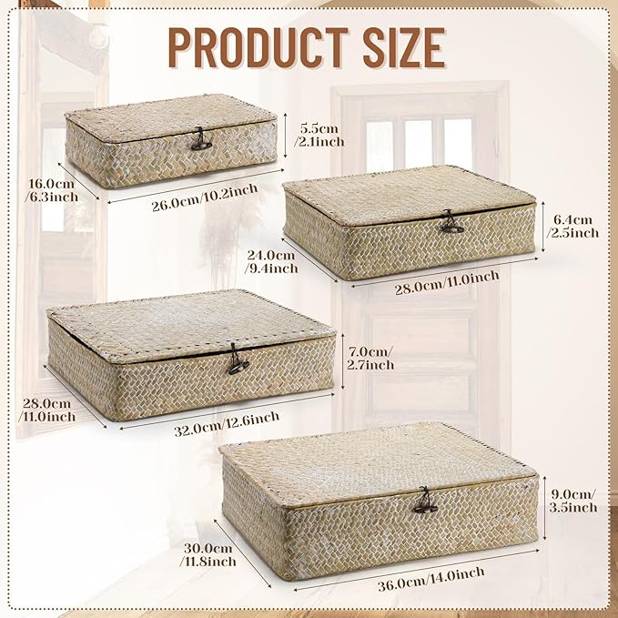 - Seagrass Basket with Lid Set: we will provide you with 4 pieces of decorative storage boxes with lids, designed in 4 different sizes, suitable size to place on shelves, tabletop, drawer, bathroom counter, kitchen cabinet and more