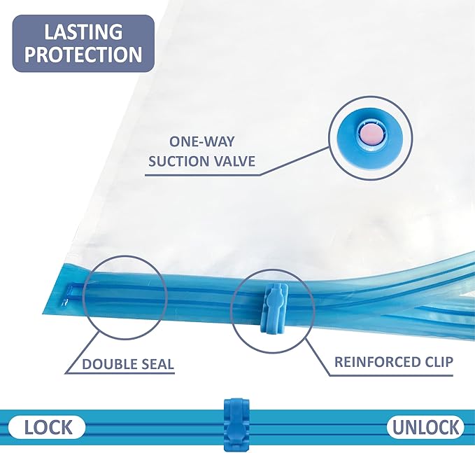 - Reliable protection: Made from extra thick plastic material, with the triple-seal turbo valve & double-zip seal design, our vacuum sealed bags get the air out in the suction process; Can be used repeatedly