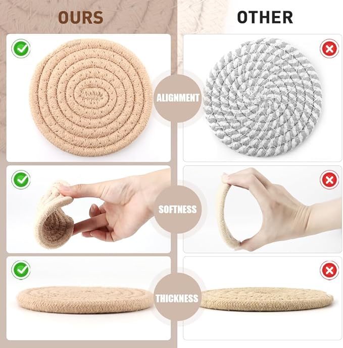 - 🍷Super Absorbent: The drink coasters are handcrafted from 100% cotton and linen, compared with silicone or ceramic drink coasters, thicker(0.3inch/8 mm), bigger(4.3 inch/11cm), much more absorbent. It can absorb splashing water from the cup in a few seconds, fitting all types of bottles/cups/mugs/tumblers.