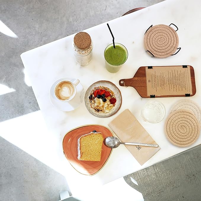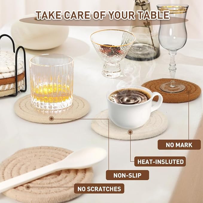 - 🥂What You Get: Our absorbent coasters set includes 8 woven coasters, 1 metal coaster holder, the choice of 4 colors can match almost any decoration in your home,especially for women's day and Mother's day. If you have any problems with your product, please feel free to contact us and we will offer you a refund or replacement service.