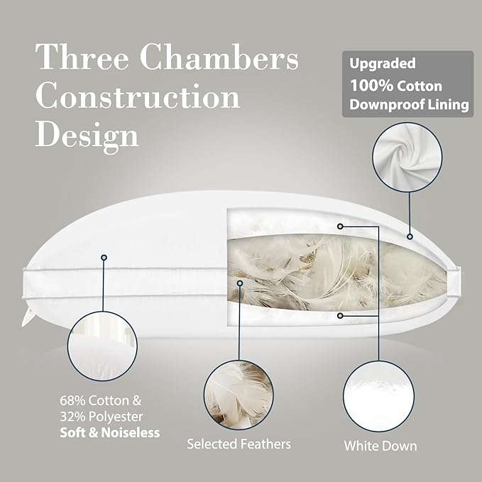 - UNRIVALED SUPPORT AND SOFTNESS: Embrace the perfect balance of support and softness with three-chamber filling design. This unique construction ensures that our down feather pillow cradles your head with gentle support while maintaining a sumptuously soft touch. Bid farewell to any discomfort as our premium natural fabric envelopes you in pure opulence.
