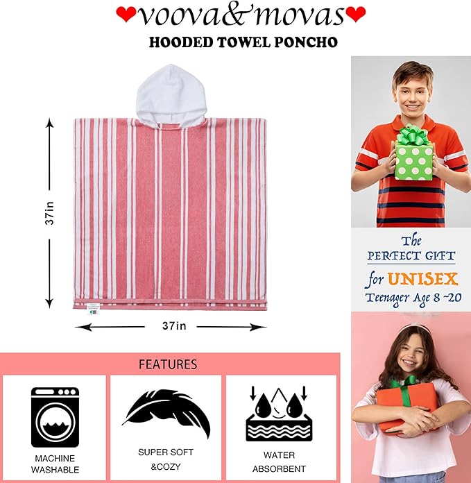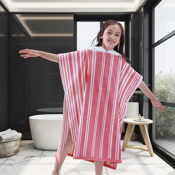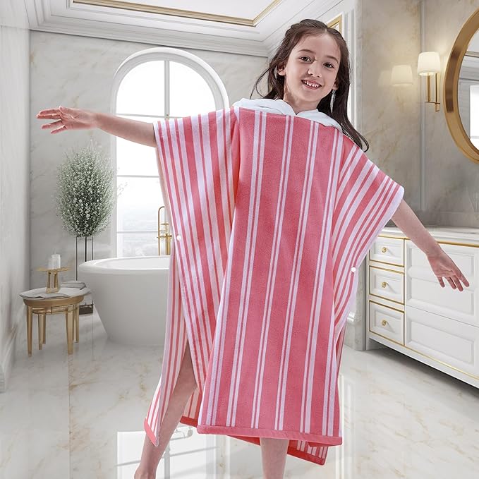 VOOVA & MOVAS Big Girl | Teens Towels with Hood (8-16Years), Large Thick and Absorbent Cotton Hooded Pool Towel Robe- Versatile for Pool, Swim, and Bath, Pink and White Cabana Striped