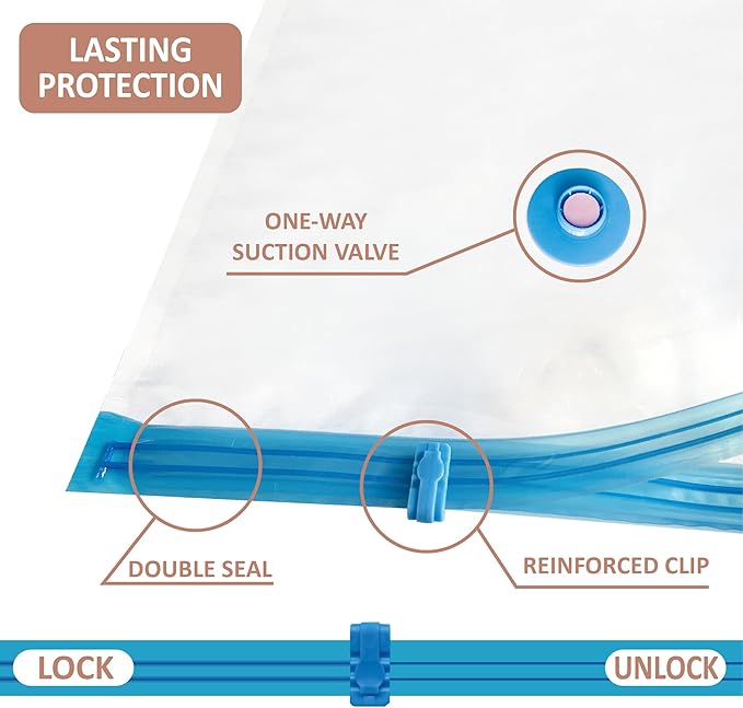 - Reliable protection: Made from extra thick plastic material, with the triple-seal turbo valve & double-zip seal design, our vacuum sealed bags get the air out in the suction process; Can be used repeatedly