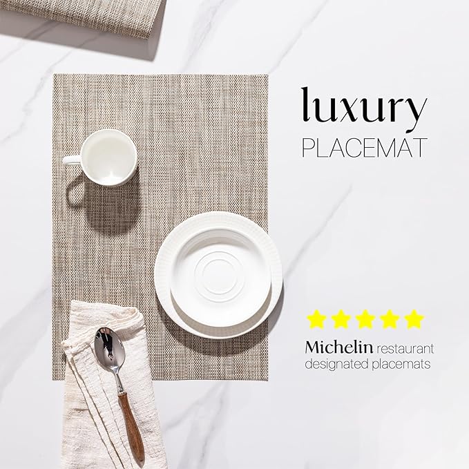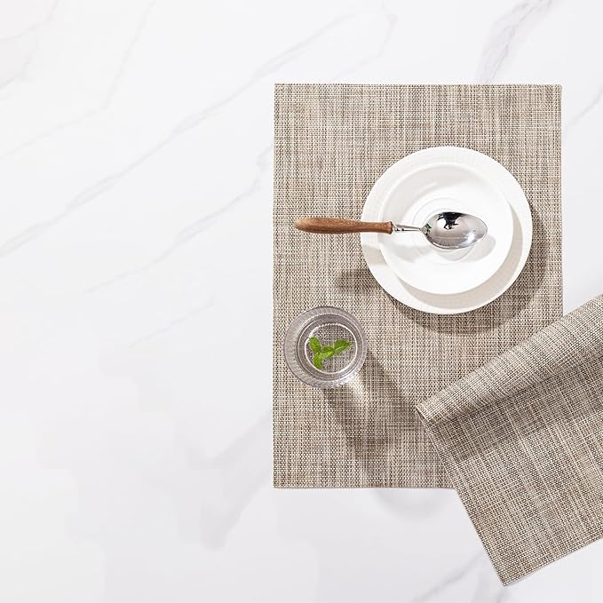 - PERFECT FOR INDOOR AND OUTDOOR:The wipeable placemat is two yarns over two, resulting in a quieter,less textural surface.The neutral color scheme and the classic size (about 12*17 inch)makes the whole table elegant and stylish full of texture!