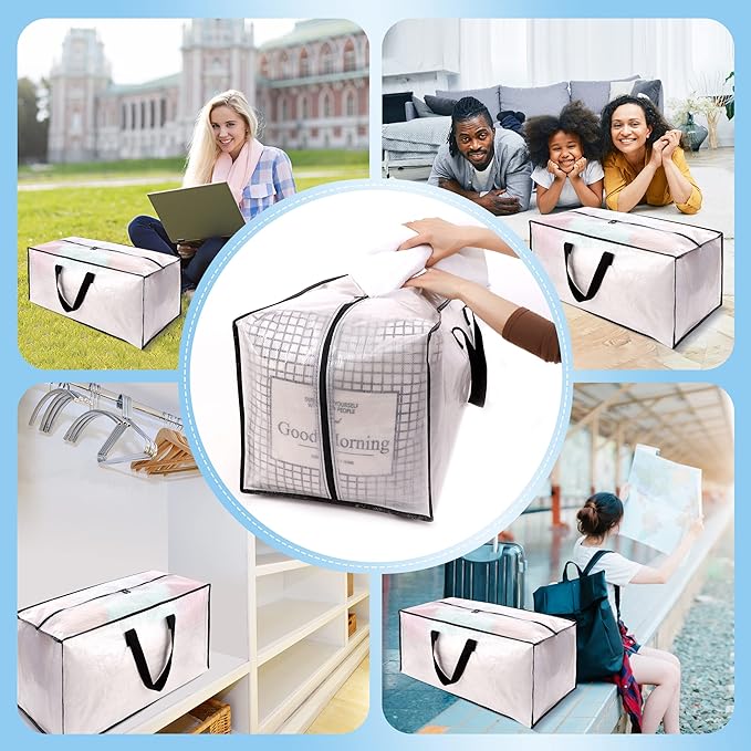 12 Pack Large Strong Moving Bags with Zippers & Carrying Handles - Water-Resistant - Heavy Duty Storage Tote for Space Saving, Fold Flat, Alternative to Moving Box (Semi-Transparent)