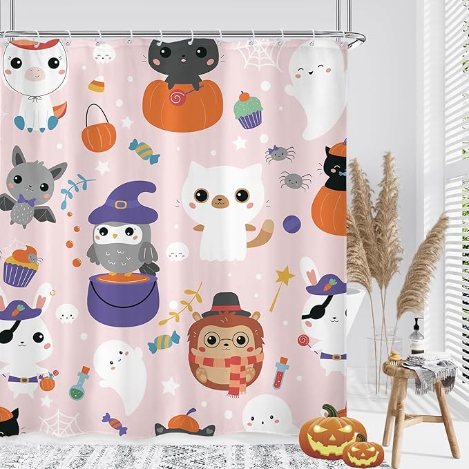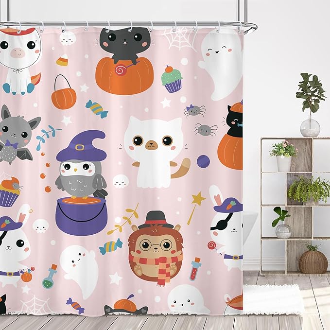 Cute Animal Halloween Shower Curtain 60Wx72L Inch Kids Child Nursery Pumpkin Cartoon Ghost Spider Bathroom Set Accessories Decor Polyester Waterproof with 12 Pack Hooks