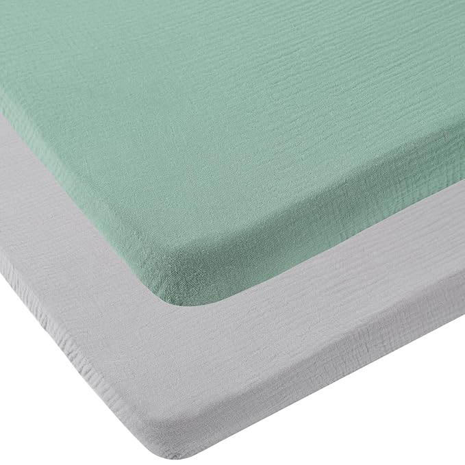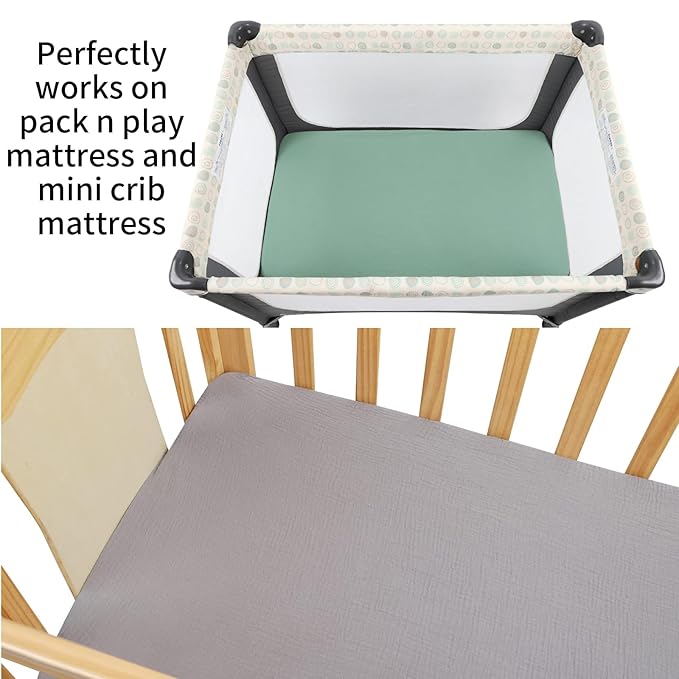 - Great Value: Package includes 2 pcs muslin playard fitted sheets, grey and green, neutral color, perfect for baby girl or baby boy. A thoughtful and practical gift for new parents or parents-to-be as our muslin crib sheets are a easy method to offer your baby a cozy and cuddly sleeping environment.