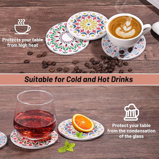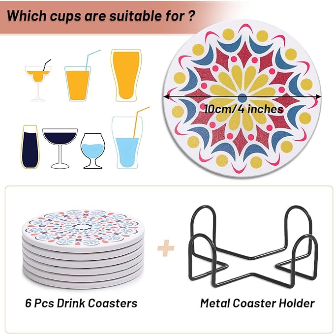 - Drink Coasters Set: This drink coasters set includes 6 pieces of ceramic coasters and a metal holder. Mandala design is suitable for home, office and party decorations. The coaster holder makes the coasters convenient for storage and make your home tidier.