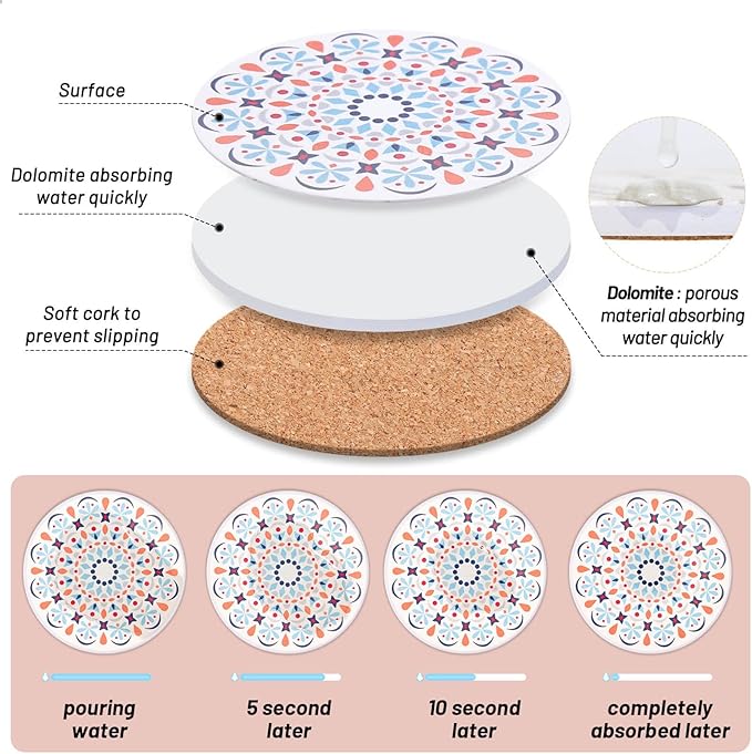 - Super absorbent: These absorbent coasters for drinks are made of special absorbent ceramic, which can absorb water stains on the surface within 5-10 seconds to keep the table top or furniture clean and dry