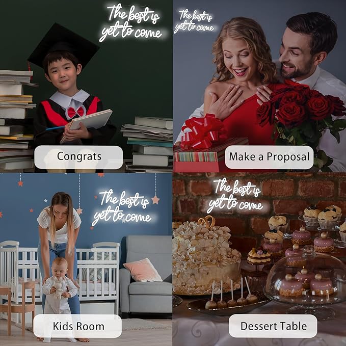 - THE BEST IS YET TO COME: We used these heartwarming words as the material to create this neon sign. White lighting in a variety of occasions can create a warm atmosphere, and it's a good choice for decoration.