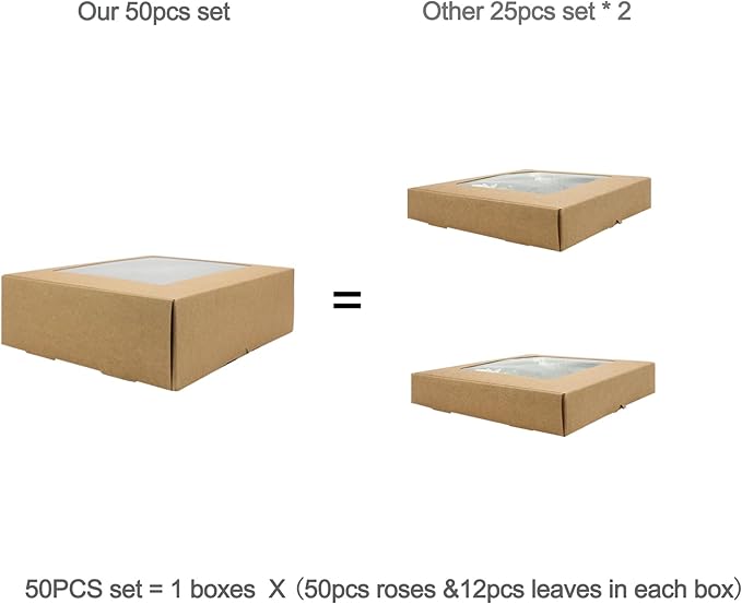 - Package: These flowers set are packaged in a nice window box that easy storage and can also be used as a nice gift. 50pcs bulk roses & & 12 leaves sets in each box.