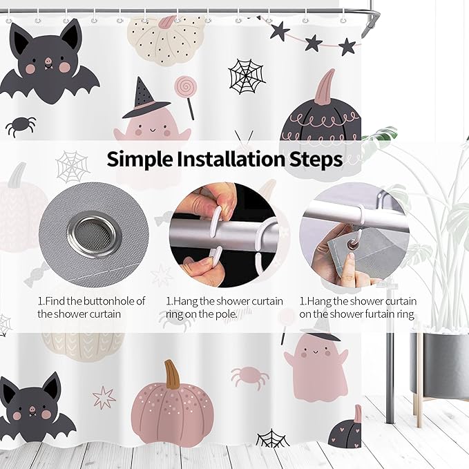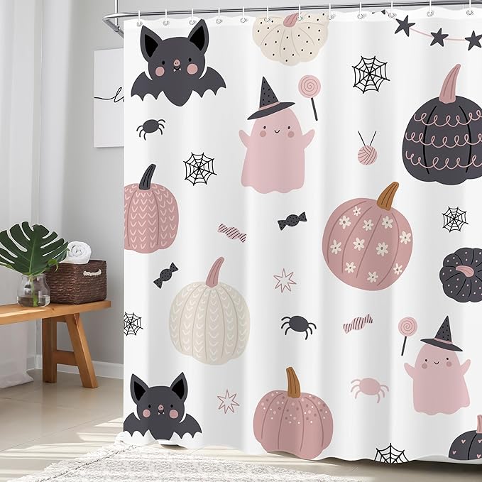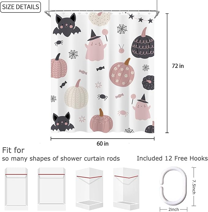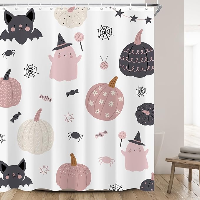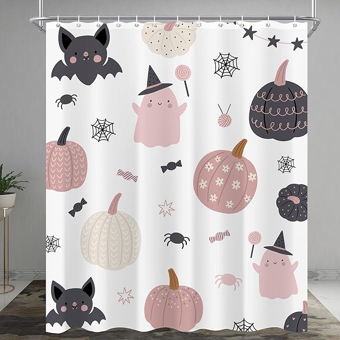 Cute Halloween Shower Curtain 60"X72" Ghost Pumpkin Spooky Funny Girls Shower Curtain Set for Bathroom Kids Cartoon Lovely Waterproof Bathtub Curtain Decor Bat Bathroom Curtain with 12 Hooks