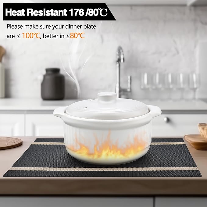 - Heat Resistant: Please make sure your dinner plate are ≤ 100℃, better in ≤80℃. It can prevent the table from slipping and scalding the countertop. These beautiful stylish vinyl place mats to add more fun to your dining table