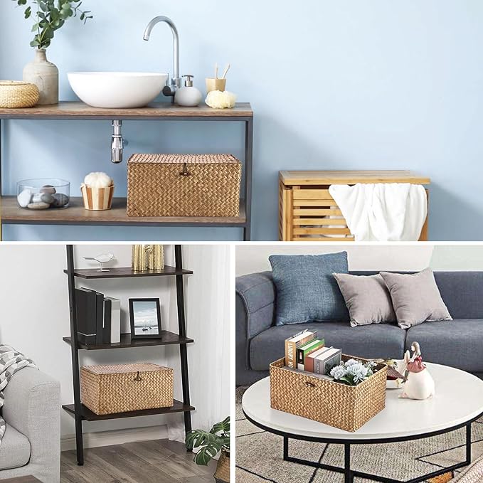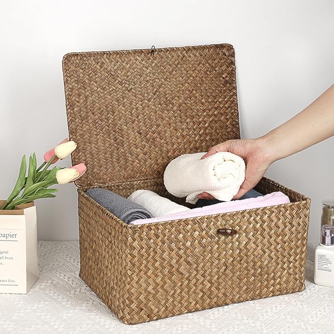 Hipiwe Wicker Shelf Baskets Bin with Lid, Handwoven Seagrass Basket Storage Bins Rectangular Household Basket Boxes for Shelf Wardrobe Home Organizer, Coffee X-Large