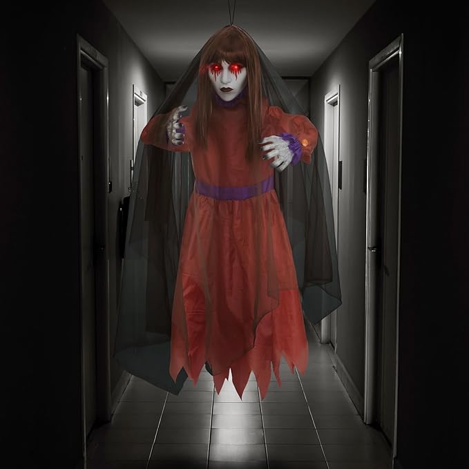 - Halloween sound activated hanging ghost girl with red dress and brown veil features a blond hair, scary bleeding eyes and posable arms