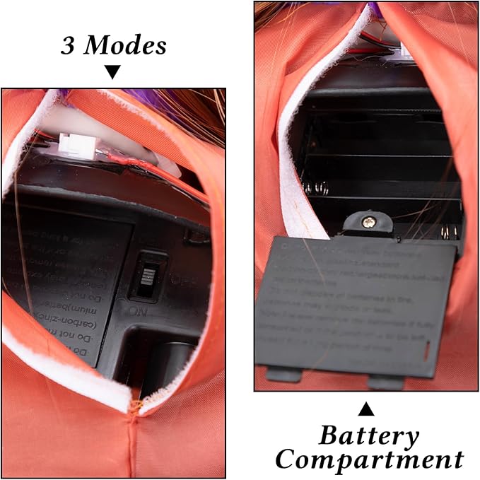 - Three modes available: “ON”, “OFF” and “DEMO”. Screaming sounds and flashing LED eyes activated by touch or sound (“ON” mode) ; Super easy to trigger