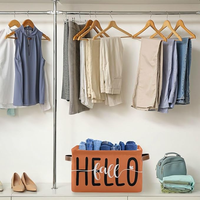 Hello Fall Orange Storage Basket Fabric Kitchen Baskets Autumn Pumpkin Open Home Storage Bins Boxes Foldable Organizer Bag for Baby Cloth Pet Toy Book Shelf Closet Baskets 16×12×8 Inches