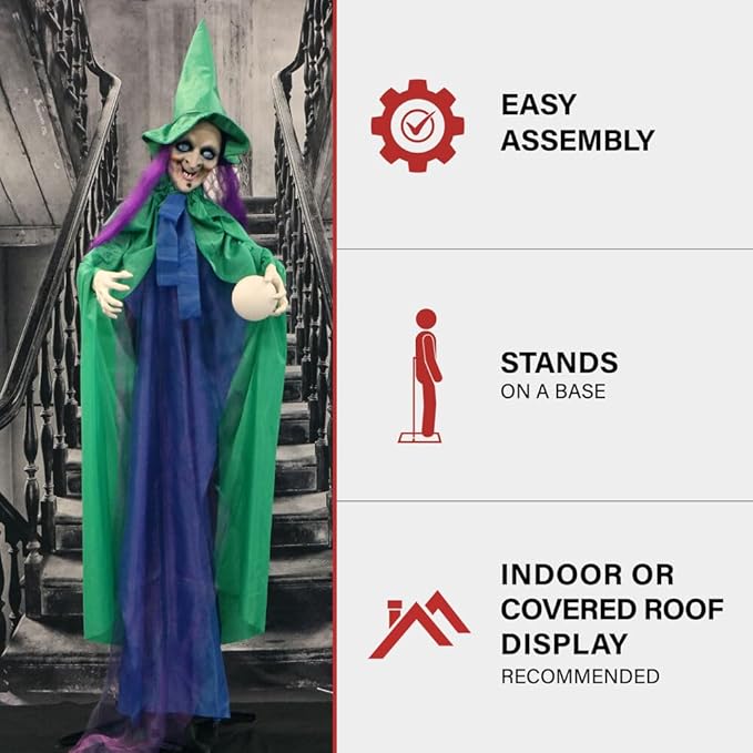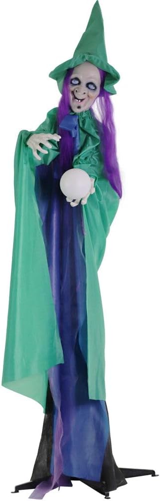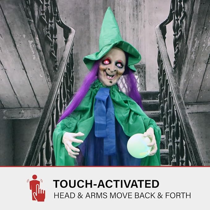 Haunted Hill Farm Talking Fortune Teller Witch Halloween Animatronic with Movement and Light-Up Crystal Ball for Scary Indoor or Covered Outdoor Halloween Decorations, Battery Operated Halloween Props