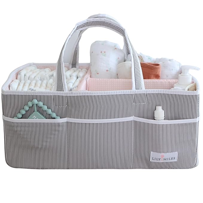 Lily Miles Baby Diaper Caddy - Organizer Tote Bag for Baby Girl Essentials - Baby Shower Basket - Nursery Must Haves - Registry Favorites - Newborn Caddie Car Travel - Gray/Blush, Extra Large