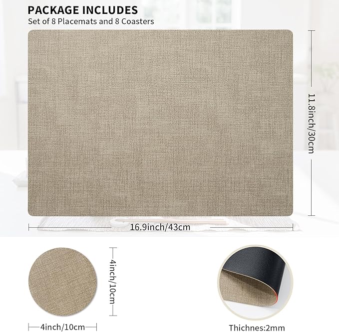 - Faux Leather & Durable- The placemats with Coasters are made of faux leather,Unlike woven or fabric placemats, these placemats are water resistant, they can block the sauce or any liquids to protect the desktop. Dual side deaign placemats with litchi pattern side and imitate the linen pattern side,both sides can be used, choose the side that you like. All of our placemats are cut by hand and look great on a variety of table tops, including glass, wood and metal