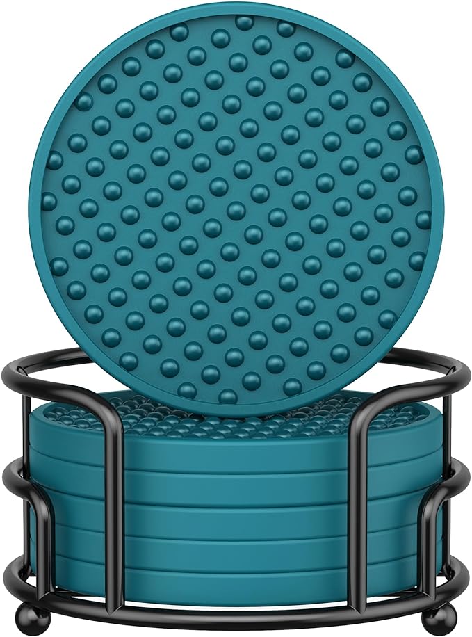 HFHOME Silicone Coasters Set with Holder, 6 Pack for Coffee Table, Bar Coasters for Home Decor Tabletop Protection - Blue