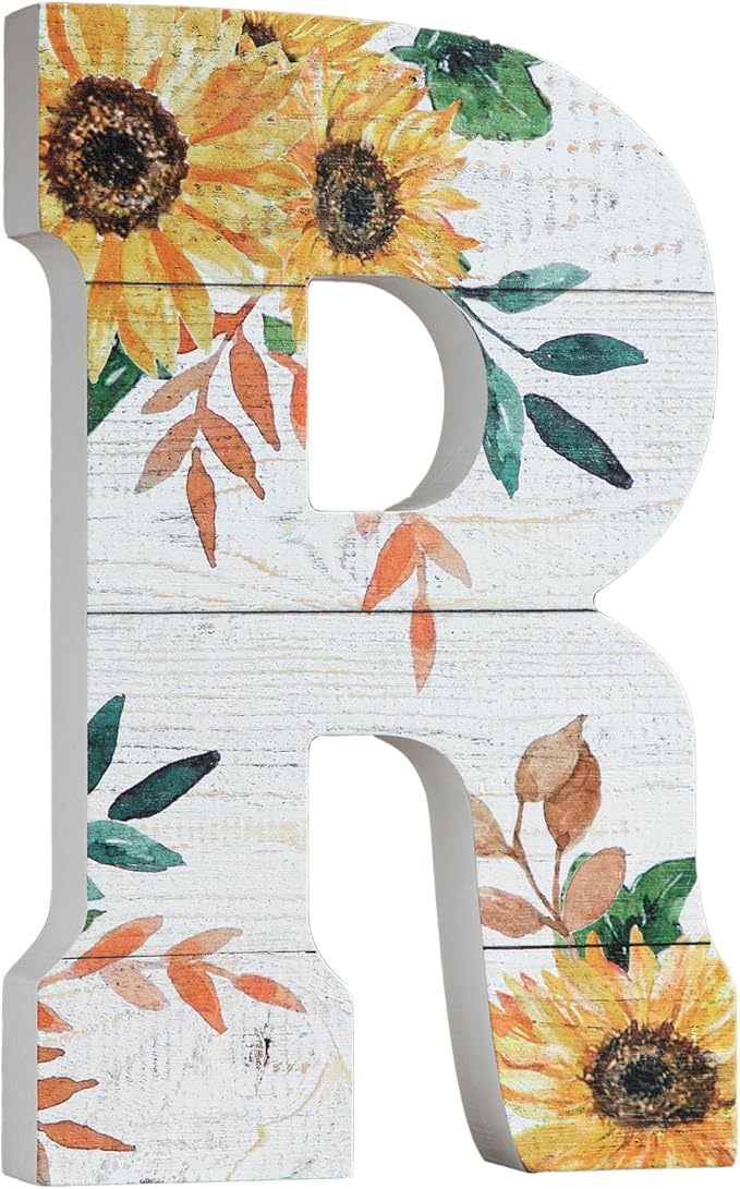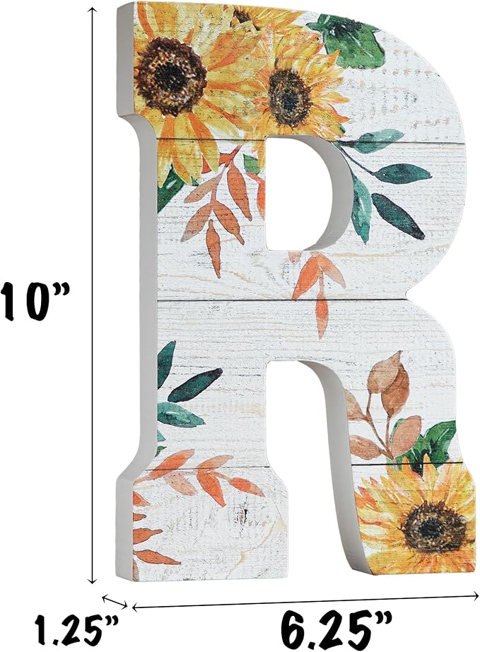 COLLECTIVE HOME - 10" Wood Lettes for Wall Decor, Sunflower Tabletop Alphabet Decoration, DIY Farmhouse Decor, Rustic Freestanding Monogram Block (R)
