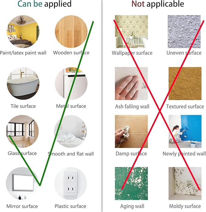 - Application Scenario: Smooth, clean, dry, dust-free and non-textured surface; wall, window, furniture, tiles, mirror, door, cabinet or refrigerator; decorating living room, baby nursery, classroom, bedroom, playroom, bathroom, kitchen, office, etc