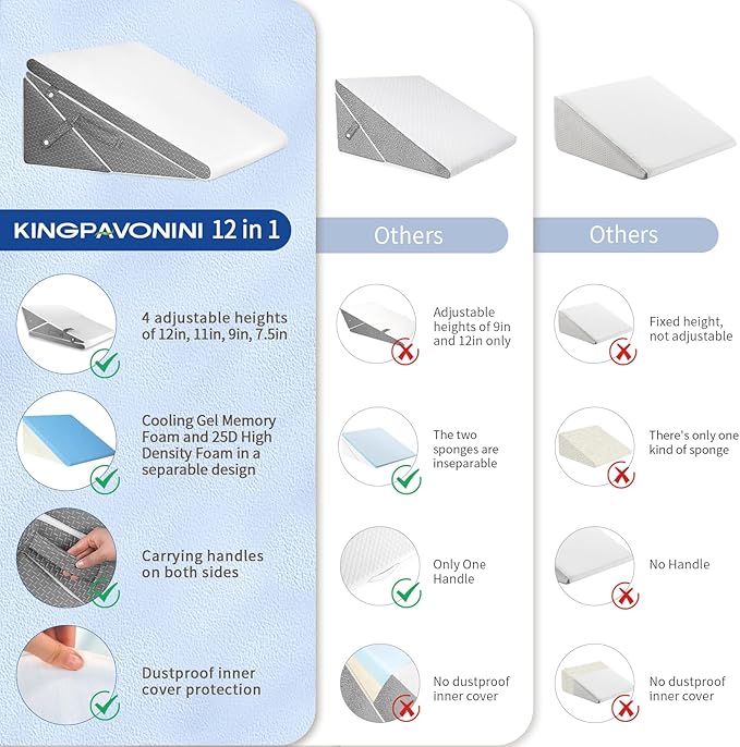 - [4 Heights & 12-in-1 Use] KingPavonini Adjustable bed wedge pillow comes in more than 12 combinations with 4 adjustable heights (7.5 and 9 and 11 and 12 inches), perfect for post-surgery recovery, side and back sleepers, improves circulation and aids sleep. Suitable for all body types. Our bed wedge pillow is CertiPUR-US and Oeko-Tex Standard 100 certified, odorless and non-irritating to the skin.