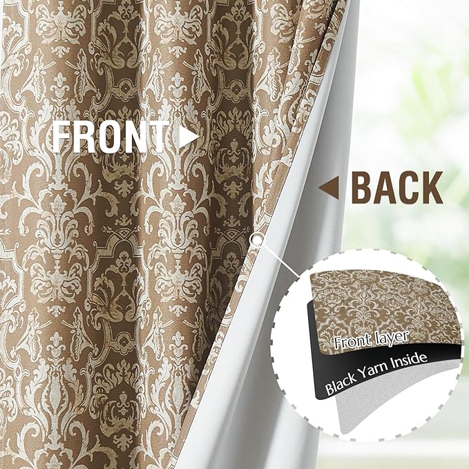 jinchan Room Darkening Curtains for Bedroom Brown Damask Patterned Curtains 63 Inch Length for Living Room Linen Textured Vintage Drapes Medallion Window Treatments Grommet Top 2 Panels Set