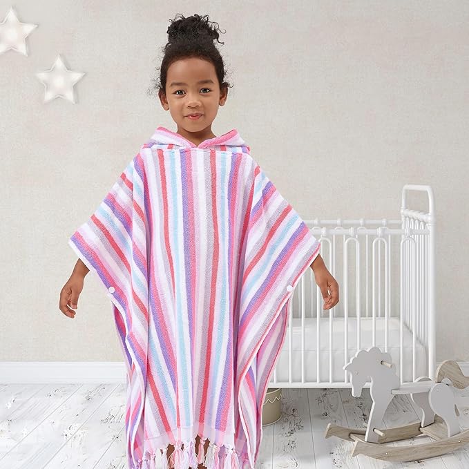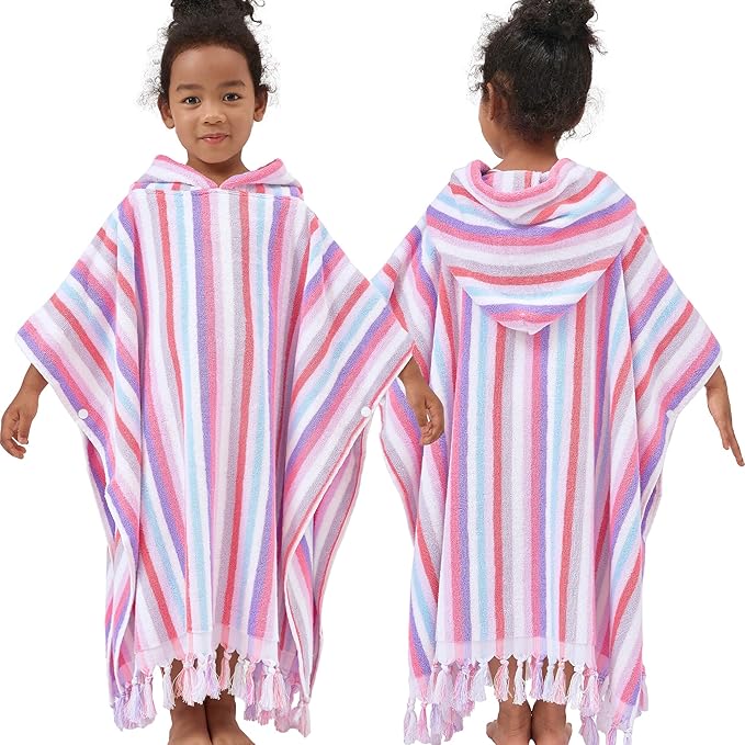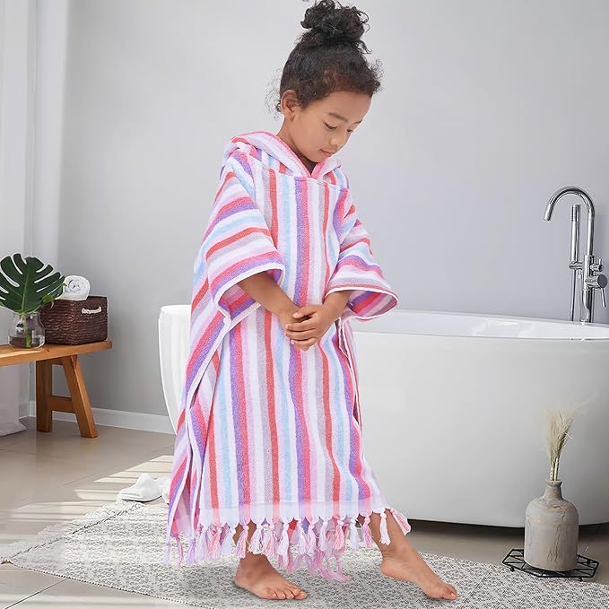Hooded Bath Towel Poncho (4-8Years) - Soft, Absorbent Premium Turkish Cotton Thick Swim Towel Robe with Hood for Kids, Perfect for Bathroom | Pool | Swimming, Jacquard, Color Stripe with Tassels