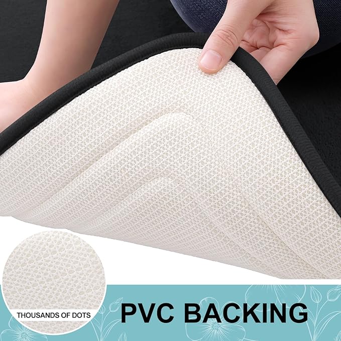 - [STABLE FOOTING] Our bathroom mat is equipped with a robust and enduring PVC backing, preventing shifting and skidding. Unlike mats with rubber backing that may wear off after washing, our bath mat ensures lasting durability. For a secure footing, keep the floor beneath the rug dry and avoid placing it on wet surfaces.