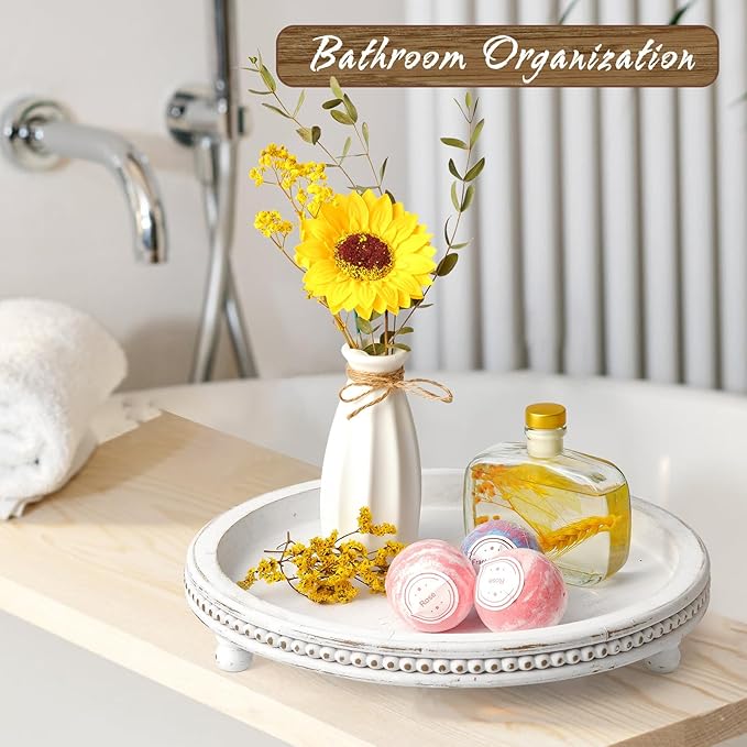 KULEDM White Washed Round Wooden Tray, Beaded Tray for Coffee Table Decor, Decorative Tray for Coffee Table, Dining Room Table Entryway and Living Room Table, Weathered White
