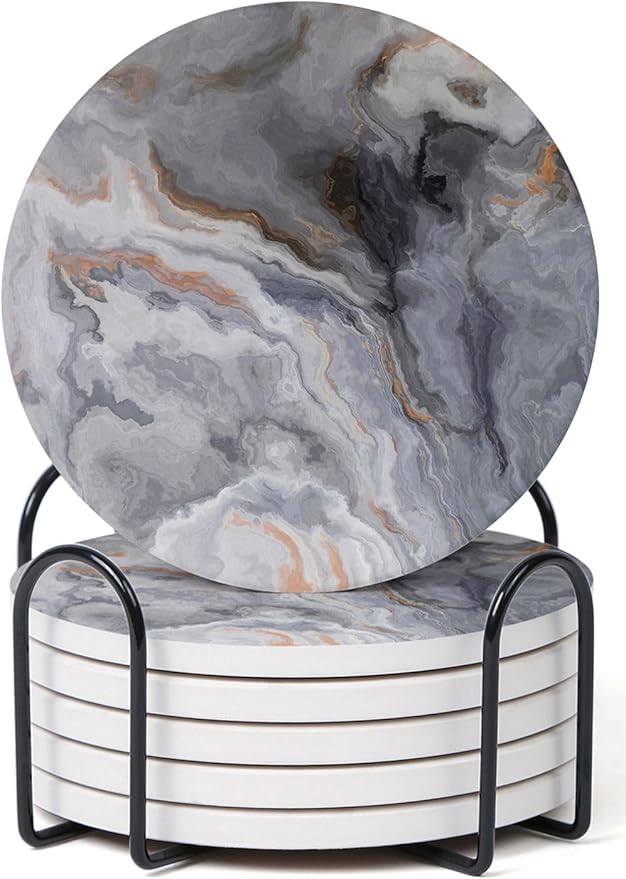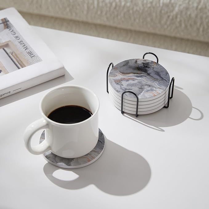 - Quick Water Absorption - Made of high-quality absorbent ceramic, the coasters quickly absorb dripping coffee stains on 5-10 seconds that can keep your table shiny and clean.In addition,it equipped with a cork backing to prevent scratches on the table.