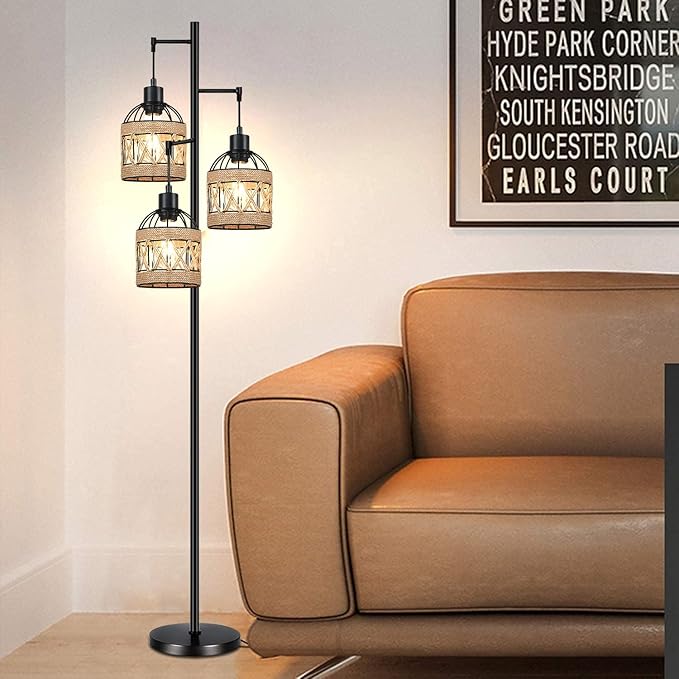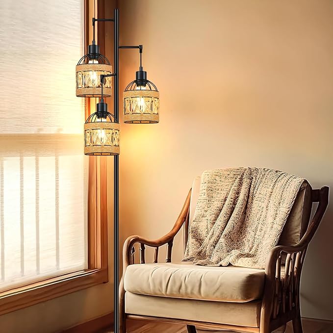 Floor Lamp for Living Room,Bedroom,3-Lights Boho Rattan Tree Floor Lights,Industrial Black Farmhouse Standing Lamp Wicker Rustic Tall Lamp,Woven Bamboo LampShade Floor Lamps Bohemian