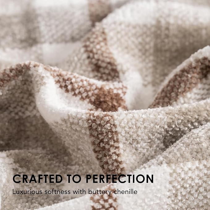 EVERGRACE Plaid Chenille Throw Blanket for Couch, Super Soft Cozy Decorative Farmhouse Plaid Throw with Tassels, Lightweight Chenille Knit Throw for Bed Sofa Gift Home Decor, Beige 60”x80”